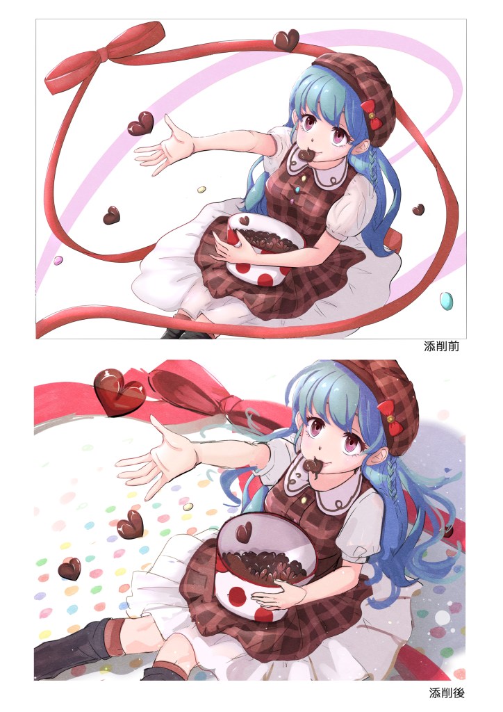 バレンタインの女の子とてもかわいいです。俯瞰構図もよく描けていると思います。